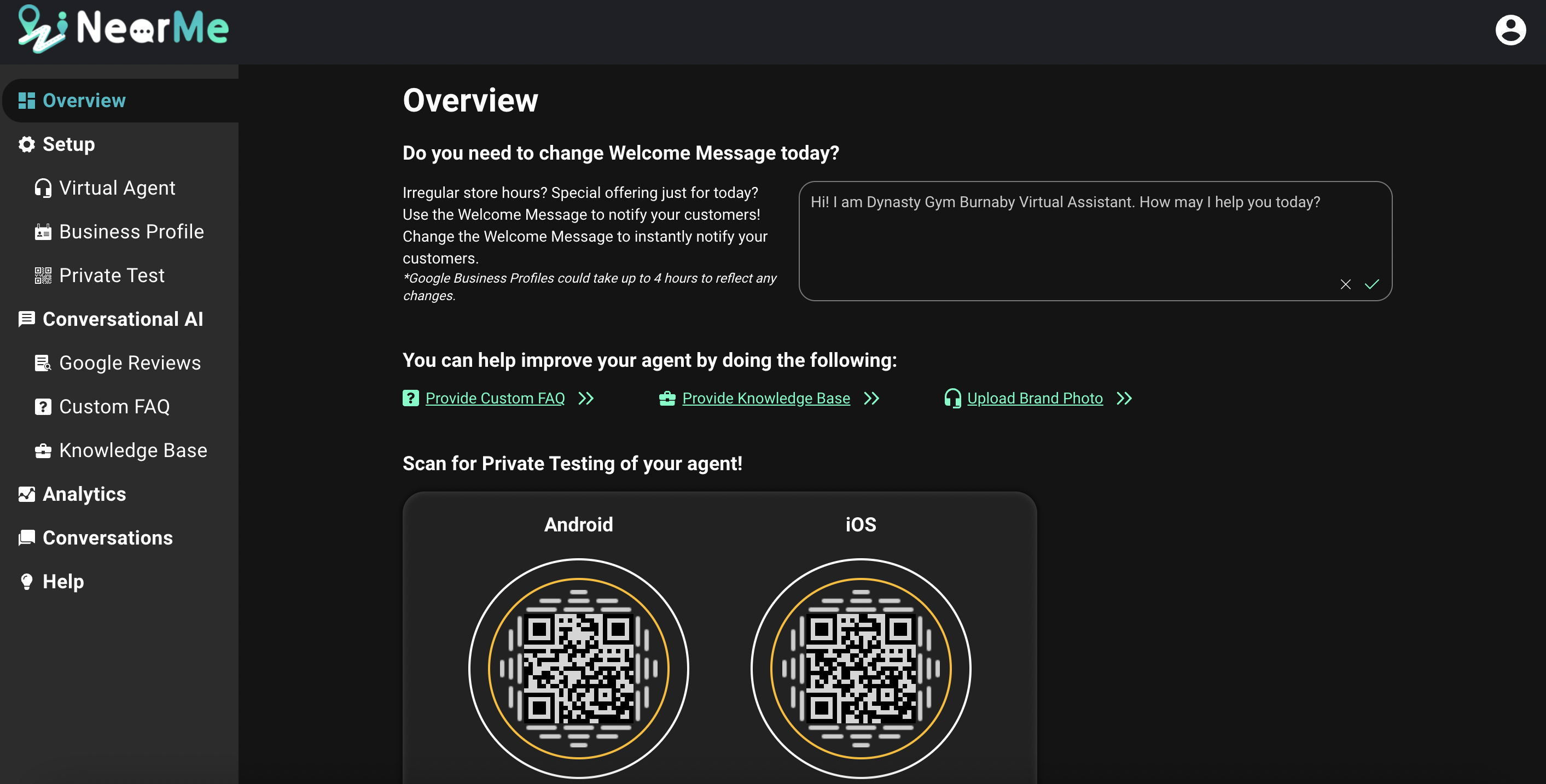 The interface of Near Me Messaging Overview page where business owners can modify the welcome message and improve their virtual agent.