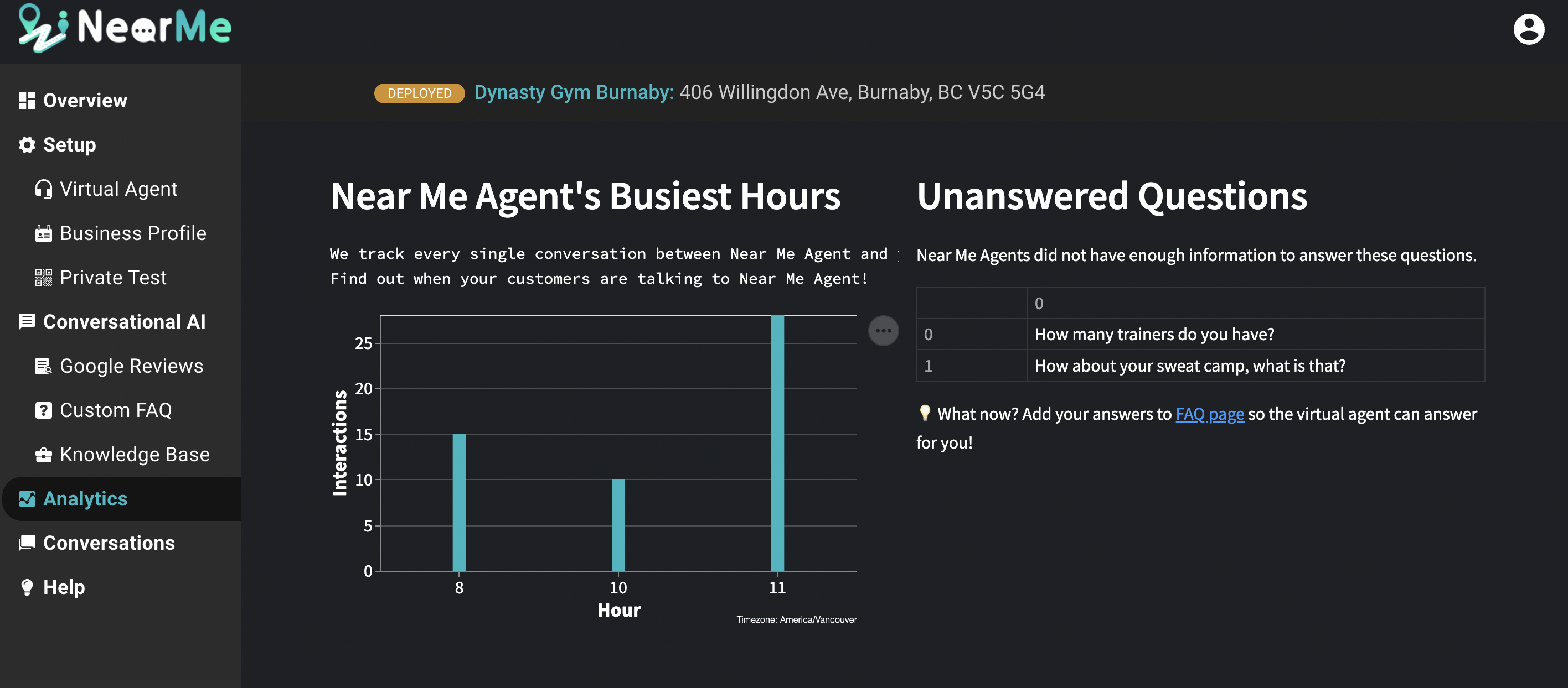 Near Me Analytics allows you to see your virtual agent’s busiest hours and unanswered questions.